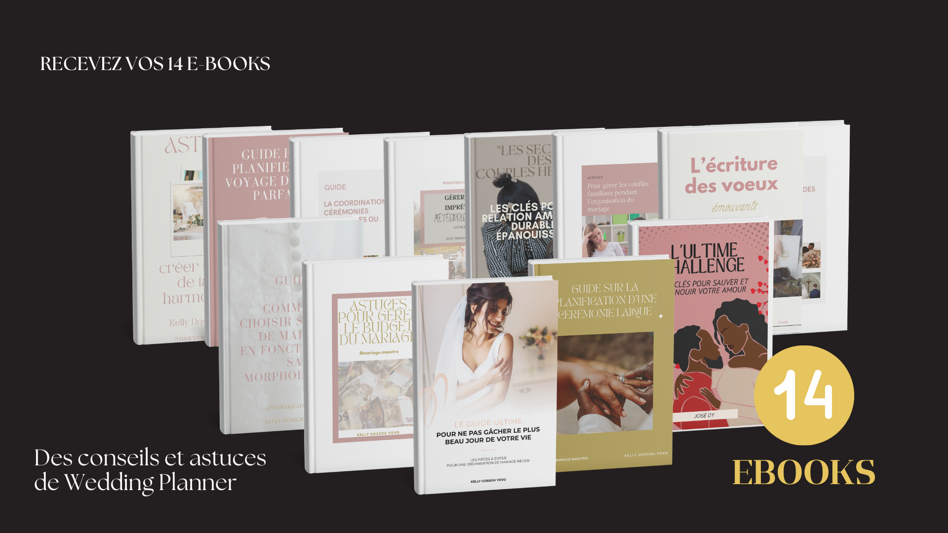 Vous souhaitez organiser votre mariage à votre rythme, tout en étant guidés étape par étape ? Le pack "L’Art de Dire Oui" a été conçu pour vous accompagner tout au long de l’organisation de votre mariage, avec méthode, clarté et sérénité. Ce pack réunit 14 ebooks pratiques, pensés comme un véritable guide de wedding planner à consulter à chaque étape de vos préparatifs.
